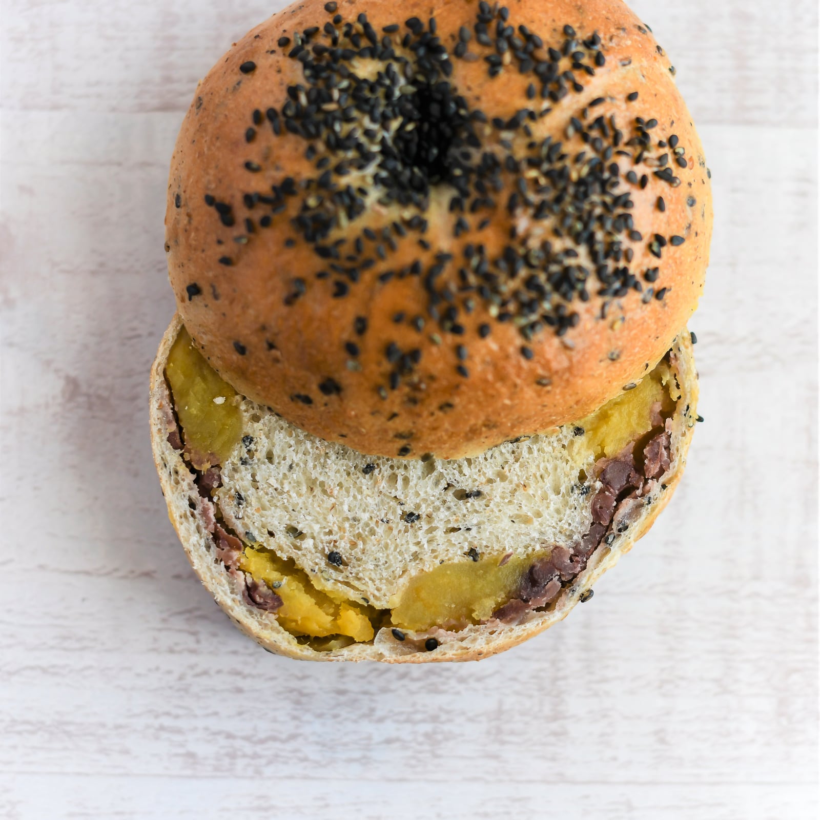 生地に黒ゴマをふんだんに入れ、安納芋と粒あんを入れて焼き上げました。