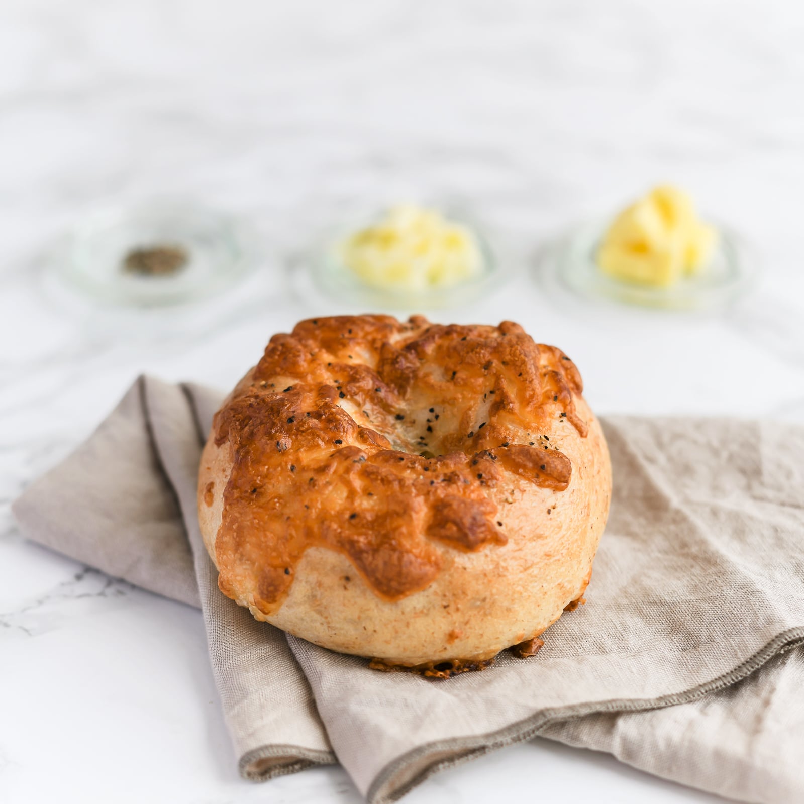 プロセスチーズをふんだんに入れ、ブラックペッパーを上からかけ、仕上げにシュレッドチーズを上にのせ、その上からブラックペッパーを掛けました。